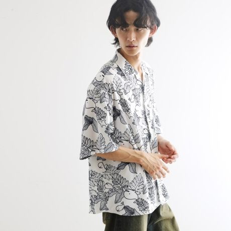 爽やかなリーフ柄プリントの中を泳ぐクジラが印象的な、オリジナル柄のオープンカラーシャツ。