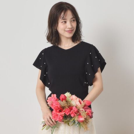 パール調モチーフを散りばめたフリル袖が甘さのあるデザインながらも、ニット素材なので落ち感があり上品な印象に。