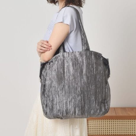 くしゅっとしたプリーツ見えのシアー素材を使用した巾着トート。