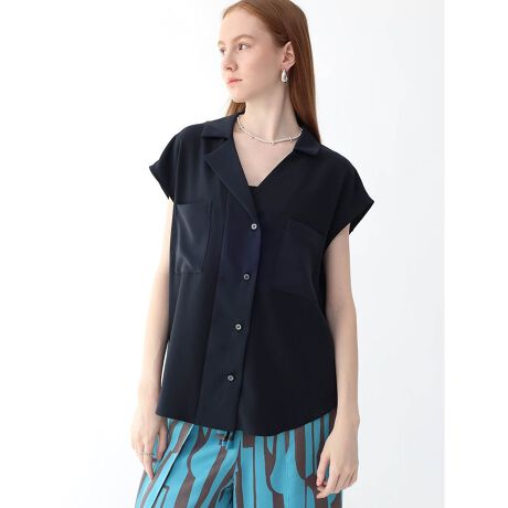 ジャケットのようなラペルとあえてダブルに仕上げた前身頃が、こなれ感たっぷりに仕上げたフレンチスリーブシャツ。胸元にはやや大きなパットポケットを施すことでデザイン性をプラス。二の腕や肩周りがすっきりと見えるスリーブ丈も嬉しいポイントです。