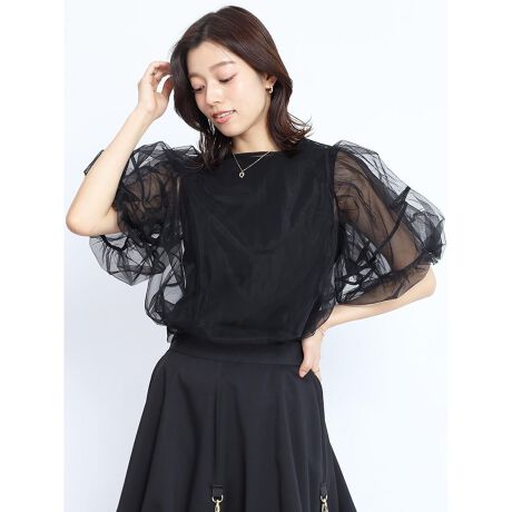 パフスリーブのチュールブラウスと、コットン100のタンクトップがセットになったトップス。