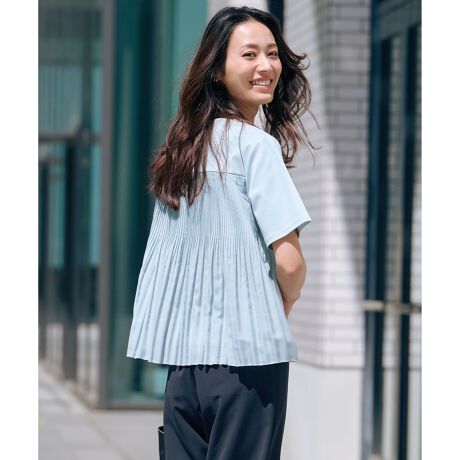 ■デザインフレアシルエットと少し長めの丈感が魅力のバックプリーツカットソー。後ろヨーク下にプリーツをドッキングし、ふんわりとした動きをプラスしています。前身頃はセンターラインに切り替えを入れ、ステッチを施すことでさりげないアクセントに。後ろのプリーツ部分にはシアー感のある軽やかな素材を使用し、ランダムなプリーツで表情豊かに仕上げました。シアー素材には裏地を重ね、透けを気にせず着られる仕様にしています。さらりと1枚で着映えする、存在感のある1着です。カラーは清潔感のあるホワイト(#001)、柔らかなニュアンスのあるグレージュ(#003)、爽やかな透明感のあるアクアグリーン(#061)、シーンレスに活躍するネイビー(#075)の4色で展開します。