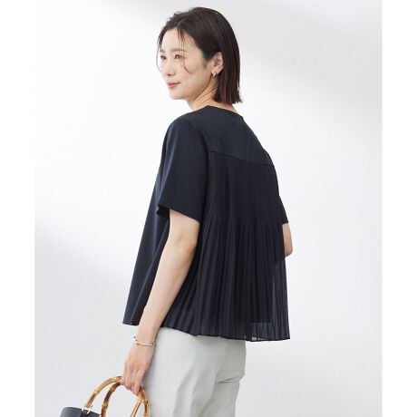 ■デザインフレアシルエットと少し長めの丈感が魅力のバックプリーツカットソー。後ろヨーク下にプリーツをドッキングし、ふんわりとした動きをプラスしています。前身頃はセンターラインに切り替えを入れ、ステッチを施すことでさりげないアクセントに。後ろのプリーツ部分にはシアー感のある軽やかな素材を使用し、ランダムなプリーツで表情豊かに仕上げました。シアー素材には裏地を重ね、透けを気にせず着られる仕様にしています。さらりと1枚で着映えする、存在感のある1着です。カラーは清潔感のあるホワイト(#001)、柔らかなニュアンスのあるグレージュ(#003)、爽やかな透明感のあるアクアグリーン(#061)、シーンレスに活躍するネイビー(#075)の4色で展開します。