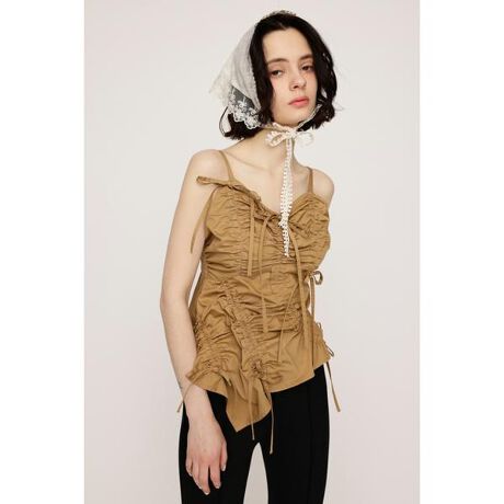 【DRAWSTRING CAMI TOPS】■POINT:ミリタリーな印象ながら、ドロストやリボンデザインでガーリーさも兼ね備えたキャミトップスです。■DETAIL:全体に3本のドロストが施されており、お好みで調整することで、さまざまな着こなしをお楽しみいただけます。フロントのリボンで今季らしいガーリーさもプラス。素材は程良いハリ感のあるコットン素材を使用しており、カジュアルながらどこか女性らしい印象も与えてくれるアイテムになっています。■STYLING:同素材の030ISZ31-3691 DRAWSTRING HARF PTとセットアップでの着用やデニムなどカジュアルなアイテムなどとの合わせがおすすめです。足元にはあえてパンプスなどを合わせると今季らしいスタイリングになります。■FABRIC/MATERIAL:ハリ感のあるコットン素材を使用しております。本品は裁ち切り始末にしています。着用や洗濯、クリーニングの繰り返しにより、ほつれが増したり、裁ち切り部分が丸まってくる事がありますので、ご了承下さい。ほつれが目立った際はほつれた糸を引っ張ったりせず、カットして下さい。■透け感:なし■光沢感:なし■伸縮性:なし■裏 地:なし[注意事項]※画像の商品はサンプルです。実際の商品と仕様、加工が若干異なる場合があります。※画像の商品は光の照射や角度、お使いのモニター環境により、実物と色味が異なる場合がございます。※着用、お取り扱いの際は、アテンションタグをご確認ください。※一部予約商品につきましては生産上の都合によりお届け予定日や店頭発売と前後する場合もございます。※追加生産商品は、一部の店舗、通販で販売中の場合がございます。予めご了承下さい。
