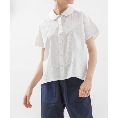 左身頃だけ異素材を組み合わせた大人かわいい丸襟のシャツ。四角いシルエットのフレンチスリーブです。身頃から津づいた袖のワイドな分量感で、サイドが垂れるこなれ感のあるシルエット。すっきりとした丈なのでスカートにもパンツにも合わせやすいです。少し後ろが長めの前後差デザイン。開けた時にちらりと見える配色ステッチもポイントです。