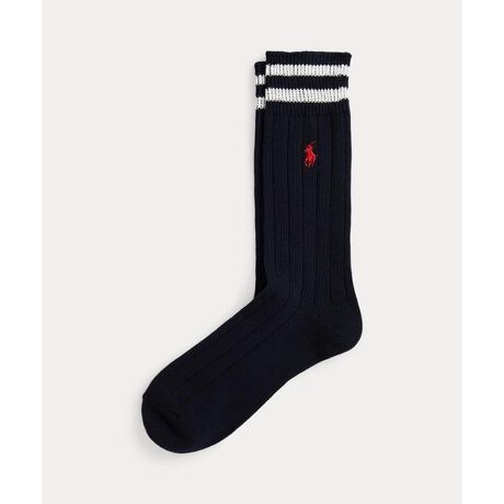 ざっくり編みのリブニット構造でデザインしたコットン混紡クルーソックス。ストライプのカフスとシグネチャーのポニー刺繍が特徴・リブカフス・左右のソックスの外側にシグネチャーのポニー刺繍※商品の色味は、光のあたり具合など諸条件により色感が多少異なって見える場合がございますので予めご了承下さい。・サイズ:22-24cm 【素材】・綿 91%、ポリエステル 8%、ポリウレタン 1%【生産国】中国