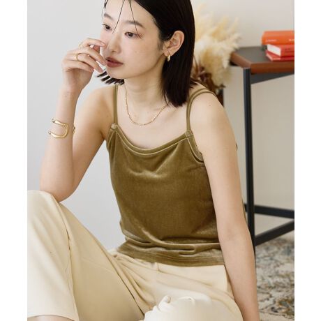 トレンド感のあるベロア生地のインナー。カップ付きなので1枚で楽に着ていただけます。ショート丈でありながら身幅にゆとりがあり、シャツやカーディガンのインナーとしてレイヤードを楽しめるアイテムです。透け感[なし]