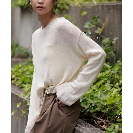 ゆったりとした身頃でリラクシーな抜け感がかわいい、からっとした風合いのニット。フロントはボートネック、バックスタイルは深めのUネックでヘルシーな印象です。ルーズな着心地ながら、肩先から共地リボンを付けてポイントにしつつ、肩からずり落ちないように仕上げています。デニム合わせでカジュアルにも、ティアードスカート合わせでフェミニンカジュアルなスタイリングもおすすめです。※モデルの着用画像の場合、光の当たり具合により、実際の色味と異なって見えることがございます。色味は、商品単体の画像をご参照ください。