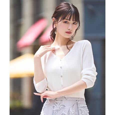 【初夏の日差しにキラキラ輝く、Vネックラメリブニットカーディガン】【Point】・すっきりと開いたVネックでデコルテを美しく見せるリブニットカーディガン。・コンパクトなシルエットと計算されたショート丈が、スタイルアップ効果を発揮しながら、女性らしくエレガンスな印象に仕立てます。・それぞれのカラーに合わせたラメ糸を選定して編み上げており、上品な煌めきを楽しめます。・羽織りとしてはもちろん、フロントボタンを留めてトップスとしての着用もオススメです。・ソフトで柔らかな肌触りの糸を使用しており、丸めてコンパクトにバッグインも出来るので、夏の日よけ対策や冷房対策に持ち歩きしやすい一着です。ケア方法:ドライクリーニング透け感:あり裏地:なし伸縮性:あり光沢感:あり生地の厚さ:中肉