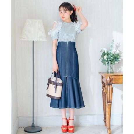 ジップ×スリットがモードな表情を見せてくれるマーメイドスカート【Design】・フロントジップがアクセントになった、モードな表情を楽しめるマーメイドスカート。・デニム調素材でカジュアル感をプラスしつつ、これからの季節にぴったりな軽やかな着心地!・裾に向かって広がるフレアが、女性らしいレディなシルエットを演出します。・ジップ下のスリットデザインが、抜け感のあるさりげない肌見せを叶え、ヘルシーな印象に♪・ウエストバックはシャーリング&レースアップ仕様でフィット感の調整ができ、ストレスフリーな履き心地です。・ファスナーの内側はボタン留めになっているので開閉も安心、フェミニンからモードまで幅広いスタイリングに活躍する一枚です♪【Fabic】・デニム調の生地を使用。・ハリ感のある裏地付き。・ホワイト、ネイビーの2色展開となります。【Care】ドライクリーニング