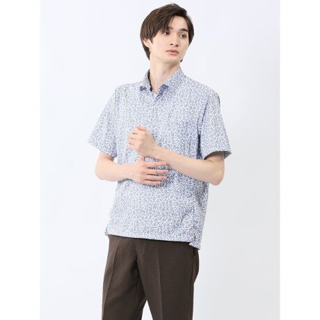 夏場のクールビズに大活躍してくれる、プルオーバータイプのビズポロです。白×青の涼しげな小花柄と衿腰内側のサテンテープがポイント。衿型は首回りをすっきり見せることができるワイドカラーを採用しています。台衿を付けたドレスシャツ仕立てで、キチンと感のあるルックスと快適な着心地を兼備した一枚です。