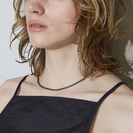 光を受けてさりげなく輝き、カジュアルにもモードにもマッチする万能ネックレス。