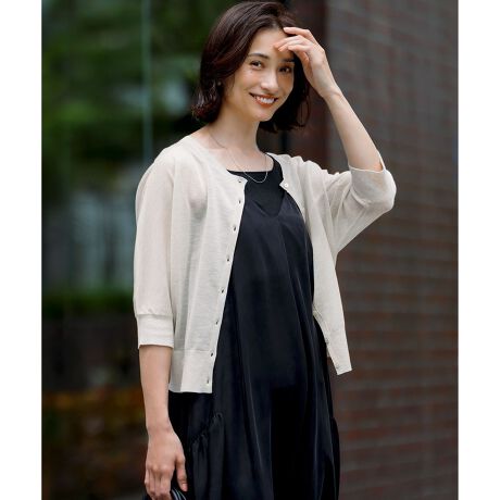 アームの締め付けのない、ドルマンスリーブの5分袖カーディガン。二の腕をカバーしつつ、上品な透け感のある素材で涼し気な印象です。襟はクルーネックで前後着用できるようにしています。裾のリブが腰で止まるような作りなので、コンパクトなプルオーバー風に着るのがおすすめです。カラーは、抜け感のあるアイボリー(#003)、ベーシックなブラック(#005)、ナチュラルな印象のブラウン(#030)、こなれ感のあるダークグリーン(#065)の4色展開です。