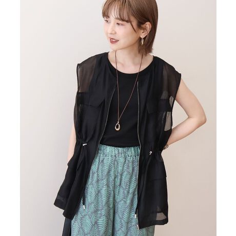 フロントのダブルポケットがポイントのデザインベスト。シャリ感のあるシアー素材で、清涼感たっぷりな1枚に仕上げました。ウエストのドロストコードを絞れば、メリハリのあるシルエットにフォルムチェンジ。いつものスタイルにプラスするだけで今年らしいレイヤードスタイルをお楽しみいただけます。透け感[ややあり]