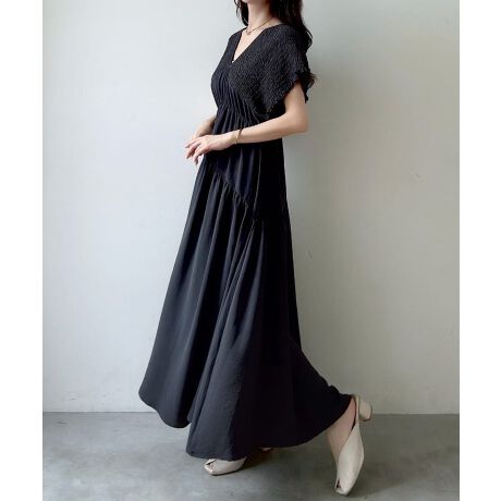 Meiru 肩シャーリングティアードワンピース
