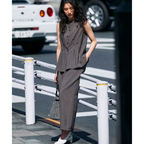 同素材シリーズとのセットアップコーデの他に、綺麗めシンプルなカットソーをウエストインするだけでもきちんと感がありつつ着映えします。