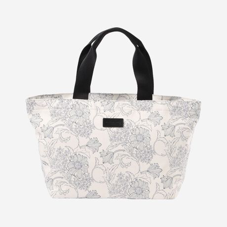 バイブリーフラワープリントのタフタ生地を使用したトートバッグです。白は線画、ネイビーはジャカード風のプリントでバイブリーフラワーを表現しています。はっ水生地を使用しており、上部には防水仕様の止水ファスナーが付いています。軽量で畳むとフラットになるので、普段使いから旅行やアウトドアにも便利です。中側には大きめポケットと、しきり付ポケット、水筒やペットボトルを等立てられるループが付いています。共地のコート(品番:G5A11556)もご用意しております。