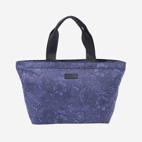 バイブリーフラワープリントのタフタ生地を使用したトートバッグです。白は線画、ネイビーはジャカード風のプリントでバイブリーフラワーを表現しています。はっ水生地を使用しており、上部には防水仕様の止水ファスナーが付いています。軽量で畳むとフラットになるので、普段使いから旅行やアウトドアにも便利です。中側には大きめポケットと、しきり付ポケット、水筒やペットボトルを等立てられるループが付いています。共地のコート(品番:G5A11556)もご用意しております。