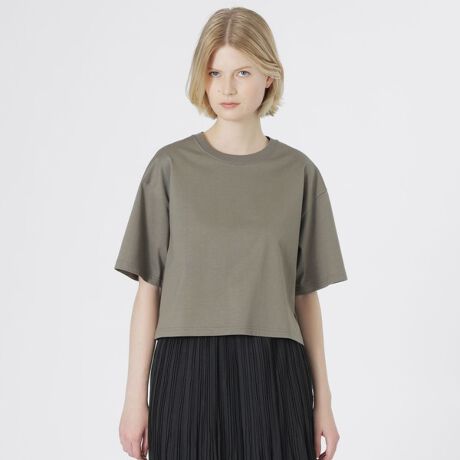 スーパーハイゲージで編み立てることで、綿のカジュアル感を残しながらもハリ・光沢感がありすっきりとした表情になっています。