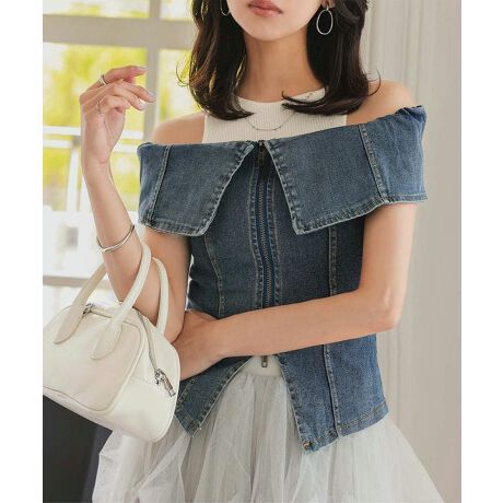 [型番:C7528]オシャレにスタイルアップ見えしてくれるビスチェトップス。ビッグカラーにトレンドのダブルジップデザインがアクセントを効かせ重ね着スタイルをアップデート。可愛くレディにもカジュアルにも着回せるデニムビスチェです。【素材・サイズ感】ストレッチ性のあるデニム素材。身体に沿うビスチェラインが女性らしくスタイルを際立たせるフィット感。アメスリトップスやキャミソールに重ねるだけでヘルシーな肌見せスタイルを楽しめるオフショルトップスです。#コウベレタス