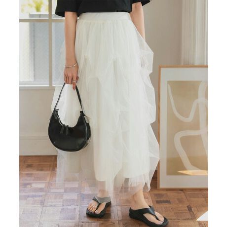 [型番:M4212]存在感あふれるバレエコアスカート。チュールのランダムなタック使いで立体感をもたらし360度可愛いアクセント。シンプルなトップス合わせでもコーデを一気に華やかに仕上げてくれる着映えスカートです◎【素材・サイズ感】適度にハリ感のあるチュール素材を使用。ボリューム感がありながらシアーの軽やかさが女性らしい柔らかさを表現。ウエストゴムで着心地よくメリハリのあるすっきりとしたバランスに見せてくれるロングスカートです。#コウベレタス