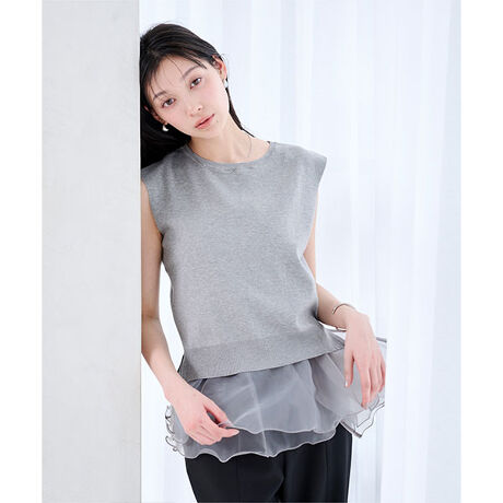 裾のシアーのペプラムベルトが大人可愛いニット◆DETAILニットはベーシックに仕上げ、1枚でも着られるのも嬉しいポイント。付属のペプラムベルトを付けると、華やかさが一段アップします。シアー素材で、程よく抜け感もプラス。[型番:BFXU1849]