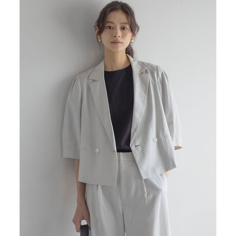 ■デザイン・タックを入れた立体的なランタンスリーブが特徴的なテーラードジャケット。・二の腕をカバーする5分袖と顔回りをすっきりと見せるテーラードカラーがポイント。・トレンドのクロップド丈で、どんなボトムとも相性抜群。・裏なしで軽さがありながらきちんと感も出せるシーンレスな大人のサマージャケット。