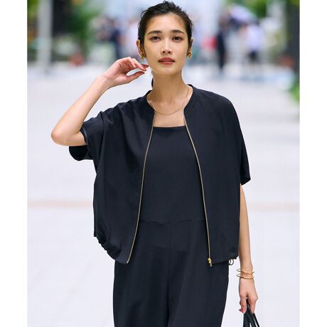 裾のドロストを絞ってシルエット楽しめるジップアップブルゾンです。デザインはスポーティーながらもしなやかな素材感で程よくエレガントな印象も加わった大人な夏の羽織りアイテム。袖はフレンチスリーブですが、ベーシックな半袖を中に着ても、袖が出にくい丈感で、様々なインナーと合わせやすい仕様になっています。また、同素材のパンツやオールインワン、ワンピースと合わせてセットアップとしても楽しめます。カラーは、様々なシーンに対応できるブラック(#005)、柔らかく肌なじみの良いベージュ(#033)、優しく上品な印象のネイビー(#075)の3色展開です。