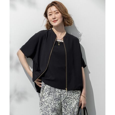 裾のドロストを絞ってシルエット楽しめるジップアップブルゾンです。デザインはスポーティーながらもしなやかな素材感で程よくエレガントな印象も加わった大人な夏の羽織りアイテム。袖はフレンチスリーブですが、ベーシックな半袖を中に着ても、袖が出にくい丈感で、様々なインナーと合わせやすい仕様になっています。また、同素材のパンツやオールインワン、ワンピースと合わせてセットアップとしても楽しめます。カラーは、様々なシーンに対応できるブラック(#005)、柔らかく肌なじみの良いベージュ(#033)、優しく上品な印象のネイビー(#075)の3色展開です。