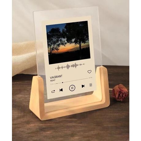 透明なアクリルパネルに写真やアートをセットし、ウォールナット調の木製スタンドが上品な印象をプラス。