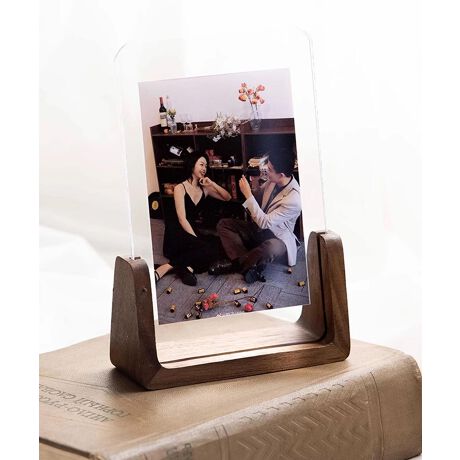 透明なアクリルパネルに写真やアートをセットし、ウォールナット調の木製スタンドが上品な印象をプラス。