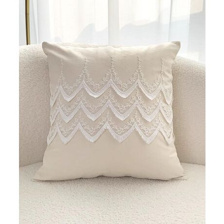 ナチュラルなベージュカラーに繊細なレース刺繍が施されたエレガントなクッションカバー。幾何学模様のレースデザインで高級感のあるインテリアに仕上がります。