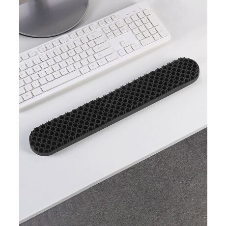 ハニカム構造を採用したシリコン製のキーボードリストレスト。優れたクッション性と通気性を備え、長時間のタイピングでも手首に負担をかけず快適に使用可能。シンプルながらも機能的なデザインで、オフィスワークやゲーミング環境にも最適。
