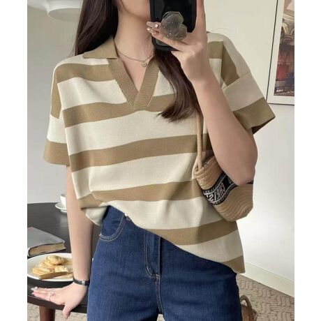 【aimoha】ワイドボーダー襟付きVネックトップス