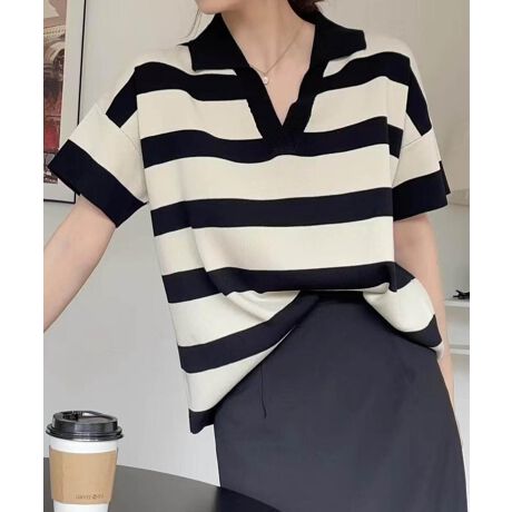 【aimoha】ワイドボーダー襟付きVネックトップス