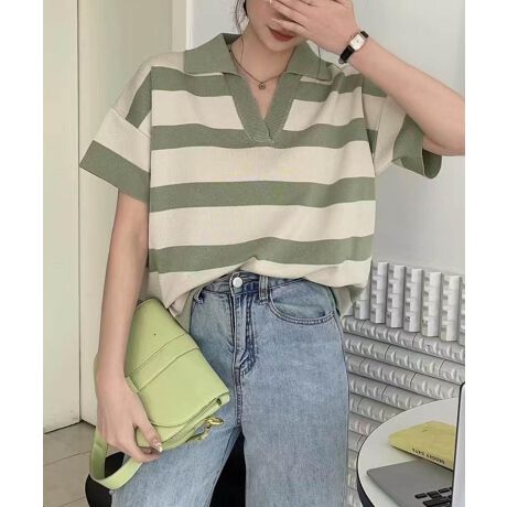 【aimoha】ワイドボーダー襟付きVネックトップス