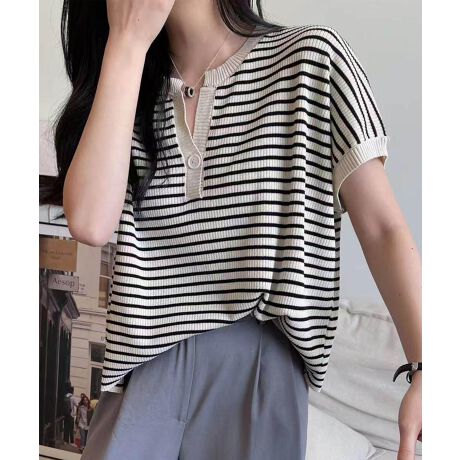 【aimoha】Yヘンリーネックボーダーリラックスプルオーバー