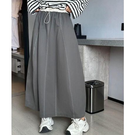 ハイウエストデザインにドローストリングがついており、ウエストラインを引き立てます。超ワイドで、動きやすさとエレガントさを兼ね備えています。落ち感のある生地を使用しており、快適で涼しげな着心地です。