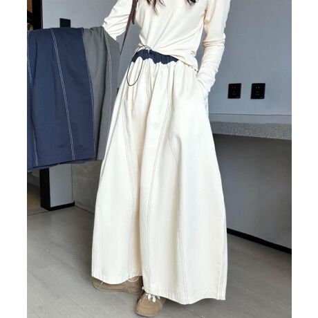 ハイウエストデザインにドローストリングがついており、ウエストラインを引き立てます。超ワイドで、動きやすさとエレガントさを兼ね備えています。落ち感のある生地を使用しており、快適で涼しげな着心地です。