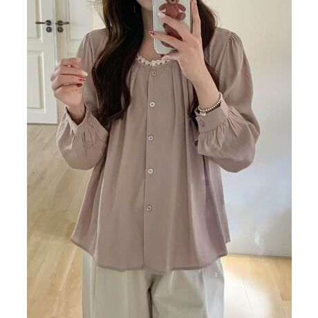 優雅で柔らかいデザインが特徴。首元と袖口にレース装飾を施しており、フェミニンな印象を与えます。シンプルでありながらも華やかさがあり、デイリーユースにぴったりです。