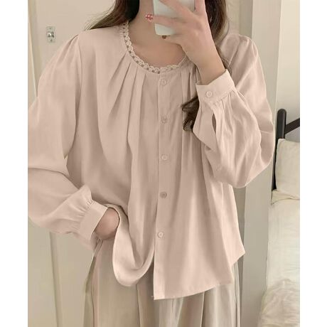 優雅で柔らかいデザインが特徴。首元と袖口にレース装飾を施しており、フェミニンな印象を与えます。シンプルでありながらも華やかさがあり、デイリーユースにぴったりです。
