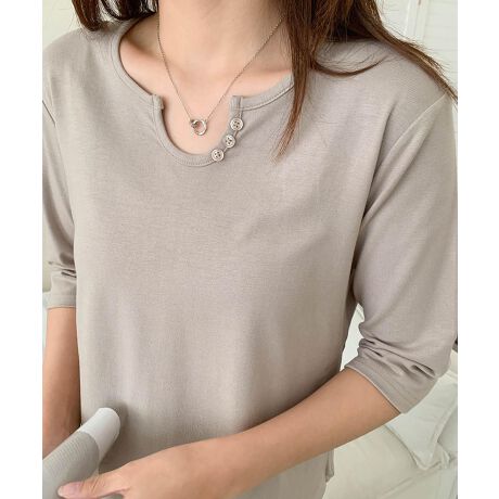 シンプルな中に程よいアクセントを加えた、ミニボタン付きの七分袖カットソー。すっきりとしたシルエットと使い勝手の良い丈感で、1枚でもインナーとしても活躍する万能な1着です。