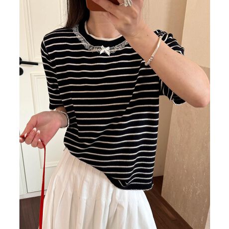 クラシカルなボーダー柄に、繊細なレース襟を組み合わせた上品なトップス。首元のさりげないリボンモチーフがアクセントになり、甘すぎず大人かわいい印象に仕上がっています。