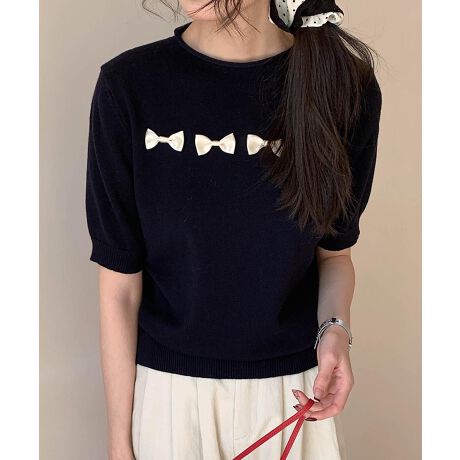胸元に並んだリボンモチーフが印象的な、甘めの大人フェミニンな雰囲気漂うトップス。程よく主張のあるディテールが、シンプルなデザインに華やかさを添えてくれます。