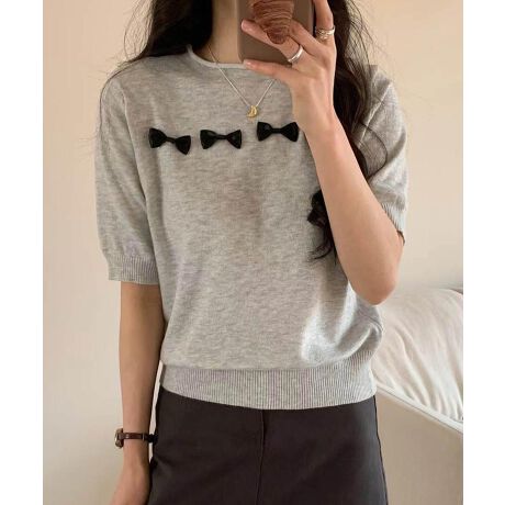 胸元に並んだリボンモチーフが印象的な、甘めの大人フェミニンな雰囲気漂うトップス。程よく主張のあるディテールが、シンプルなデザインに華やかさを添えてくれます。