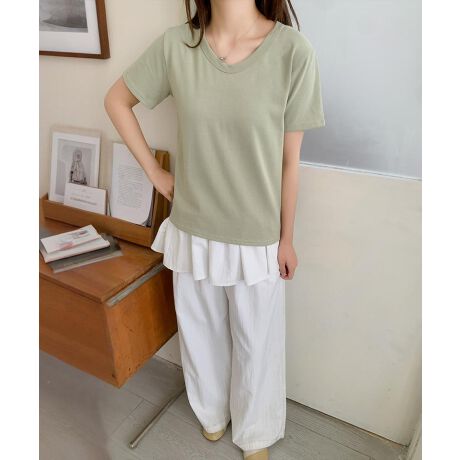 身体に優しく沿うシルエットで、綿混のしっかりした生地感で1枚着としても使いやすく、自然な落ち感がありながらもすっきりと見える仕上がり。首元からデコルテにかけてスッキリしていて、顔まわりを明るく見せてくれます。