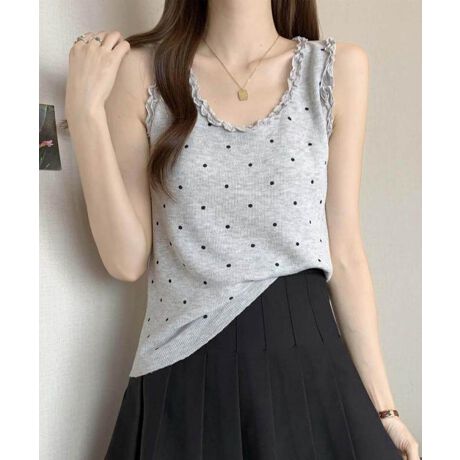 小さなドット柄と繊細なレーストリミングが目を引くタンクトップ。柔らかな印象を与えるデザインは、女性らしいやさしさとナチュラル感を引き立ててくれます。