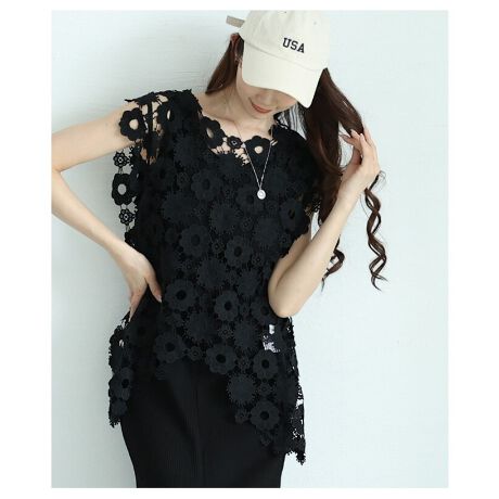 【ベスト】 トップス プルオーバー カットソー ブラック 黒 白 ホワイト ノースリーブ レース 花