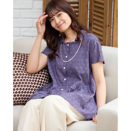 表情のあるカットジャカードを使用したペプラムブラウスです。インド綿なので軽く柔らかな風合いです。前開きなのでタンクトップとのレイヤードもおすすめです。