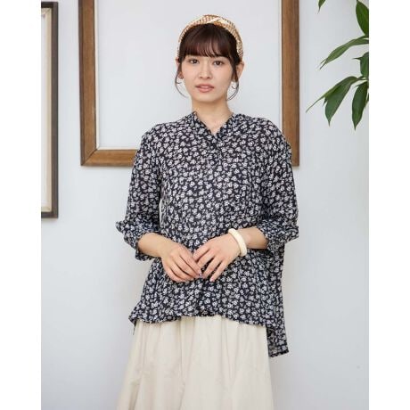 単色花柄が大人っぽい落ち着いたカラーリングのブラウスです。後ろにたっぷり取ったギャザーがシルエットに動きを出してくれます。デニム合わせがオススメです。